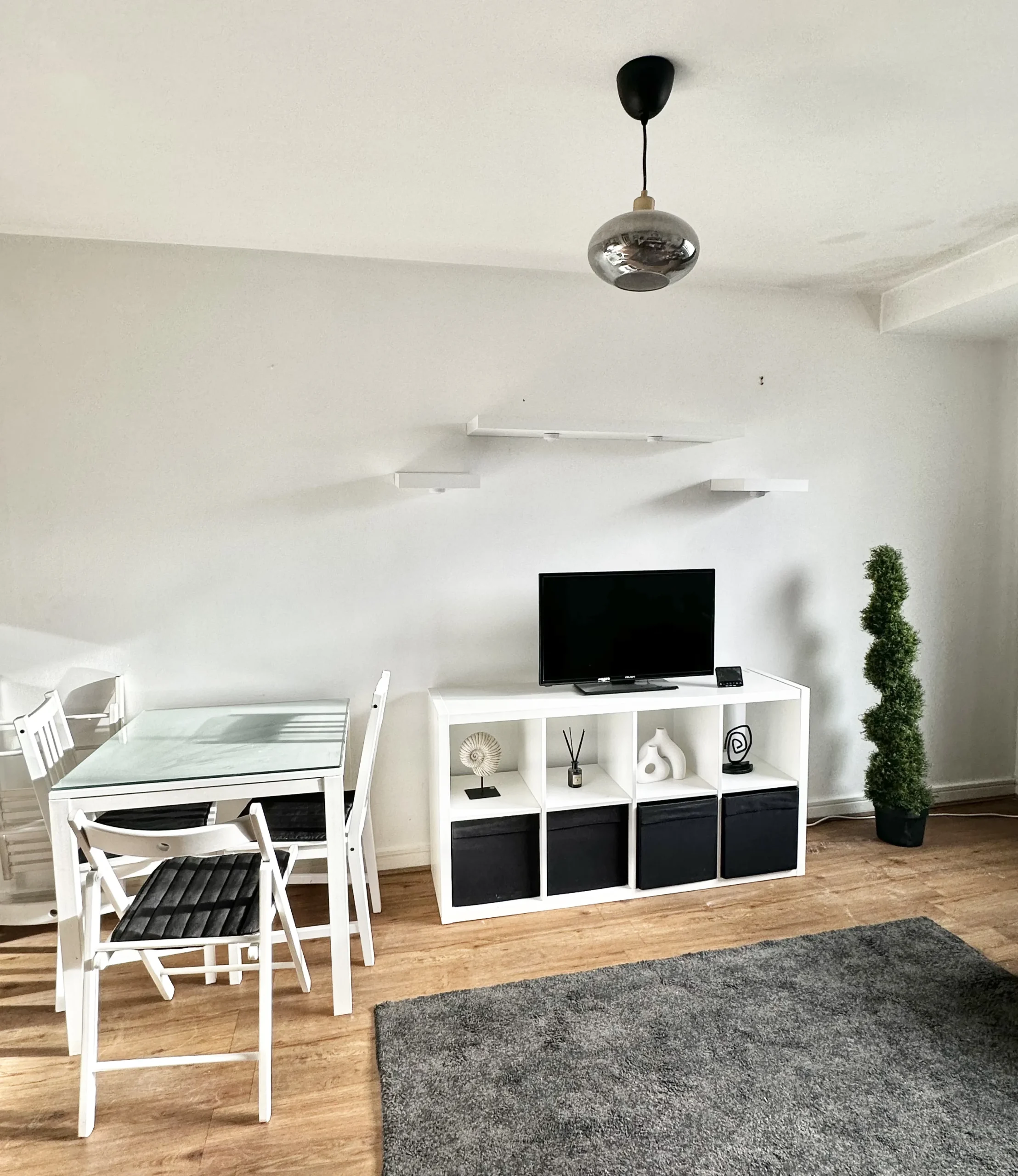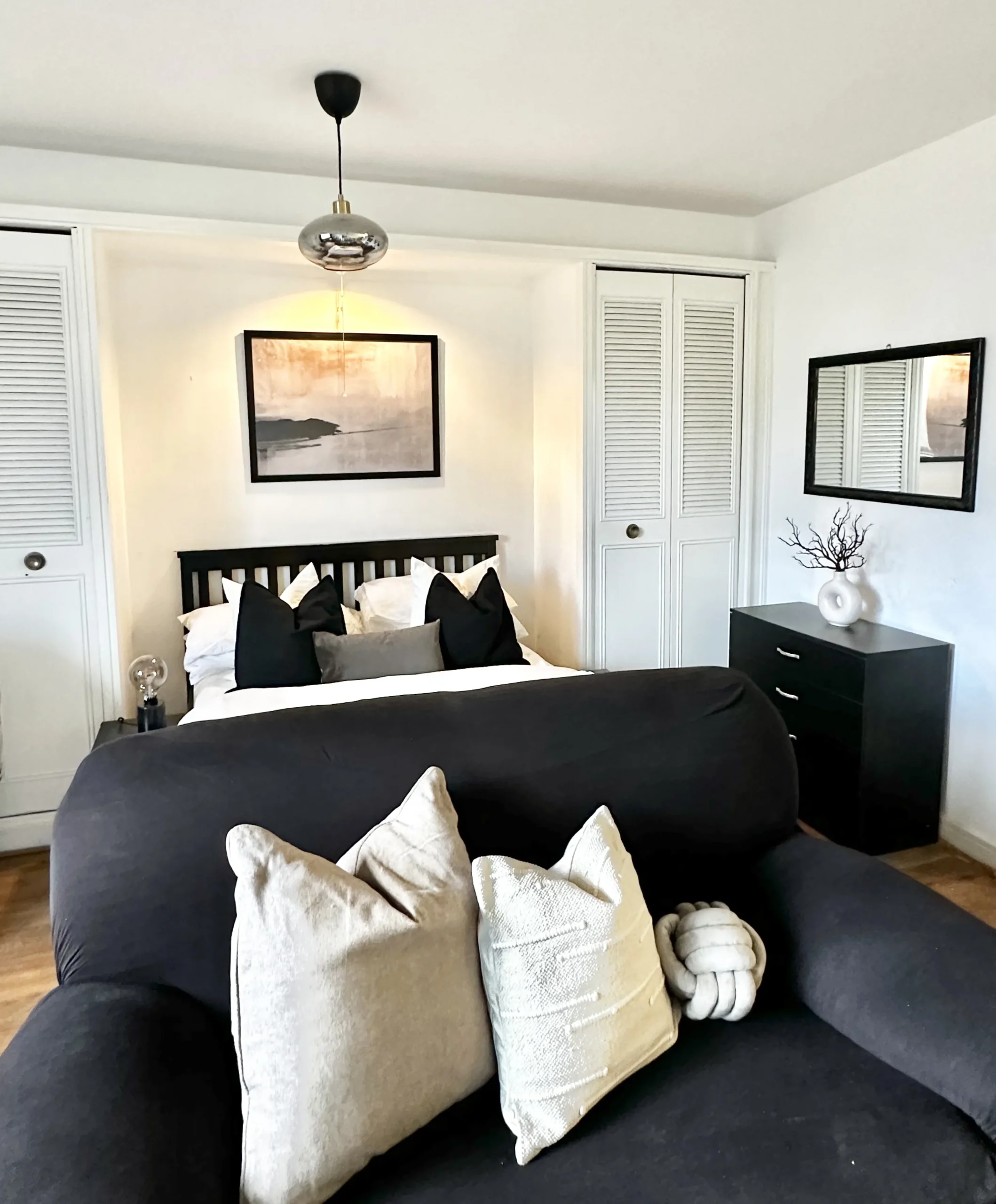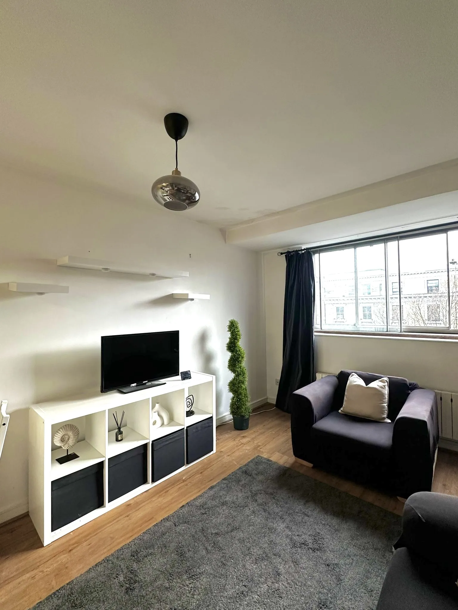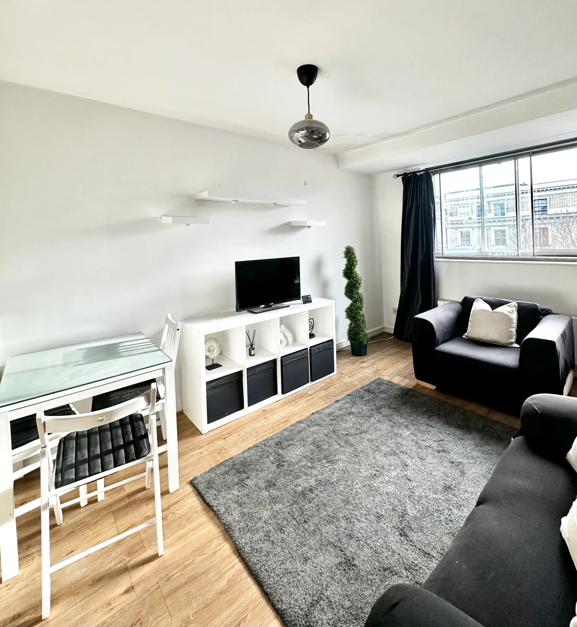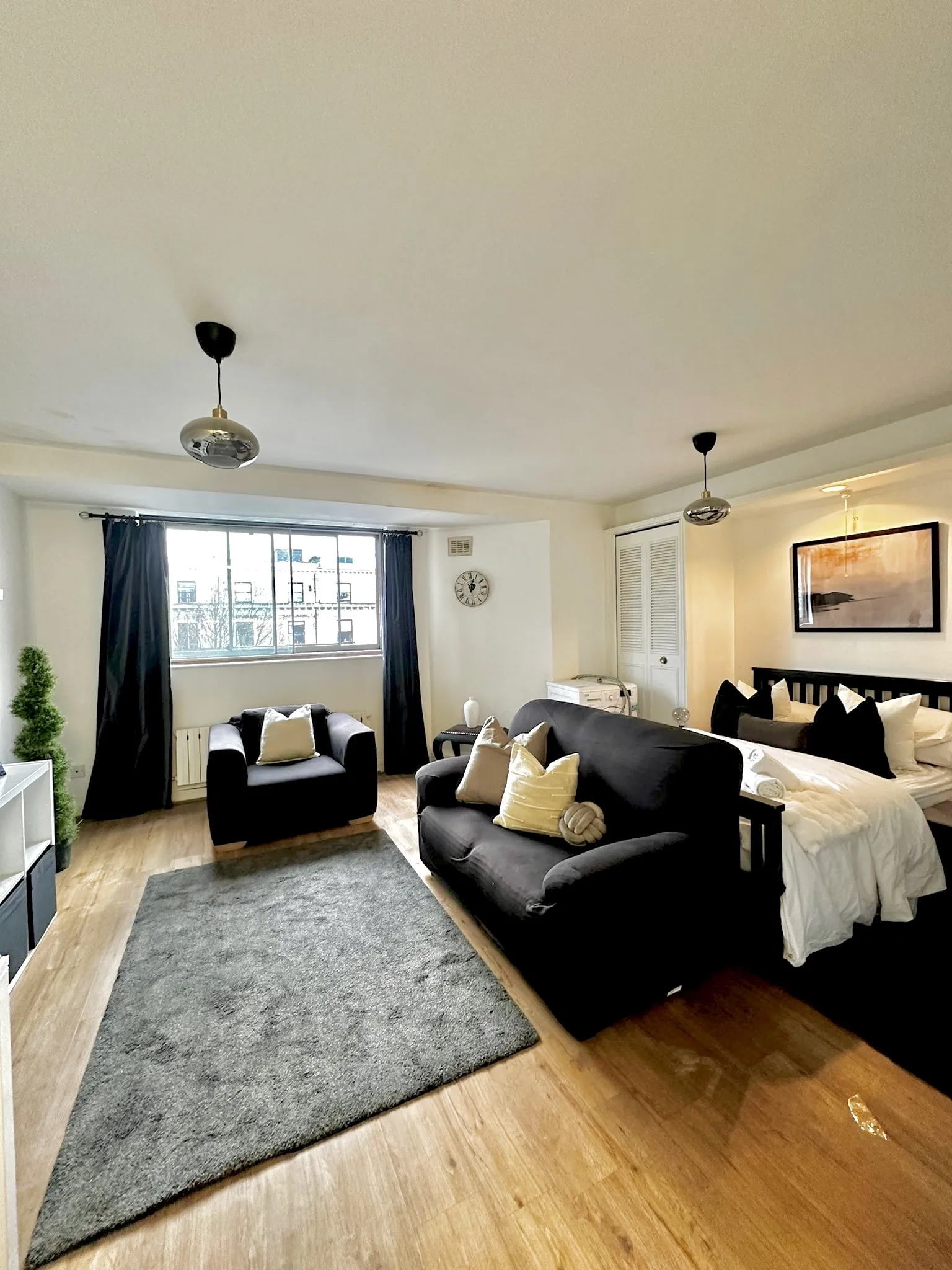 This studio flat features an open-plan layout, seamlessly connecting the kitchen to the bedroom and bathroom.