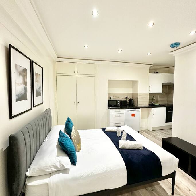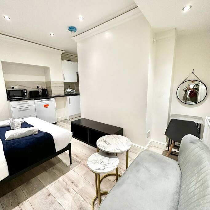 Enjoy a stylish and cosy experience at this centrally located studio. Surrounded by various shops, numerous parks, restaurants, cafes, and gyms. Very easy access via public transport; 5 mins walk from Brompton train station and 8 mins walk from Earls Court underground station. There is a fully equipped kitchen, private bathroom, and a small seating area with a smart TV.
